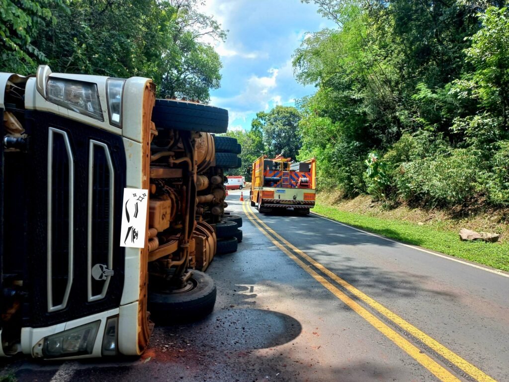 Caminhão tomba na PRC-158 e motorista fica ferido