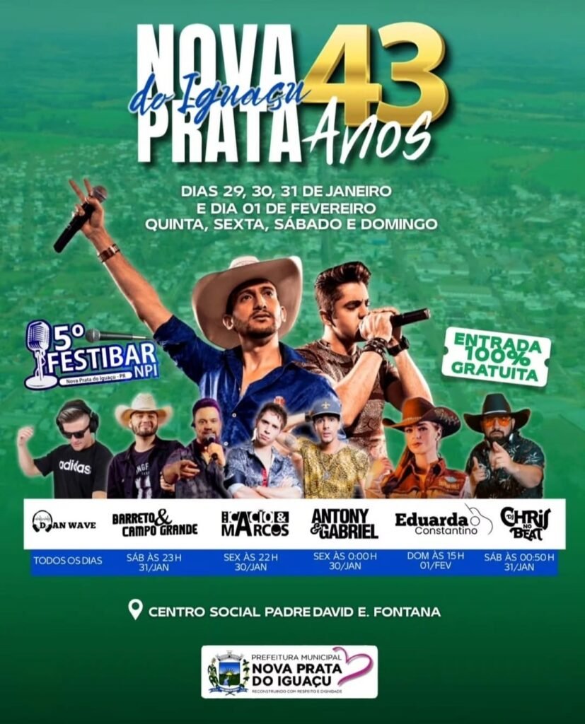 O município de Nova Prata do Iguaçu completa, no próximo dia 1º de fevereiro, 43 anos de emancipação política. Para celebrar a data, a Prefeitura preparou uma programação especial que promete movimentar a região entre os dias 29 de janeiro e 1º de fevereiro. As festividades unem cultura, música e tradição religiosa, oferecendo opções para toda a família.