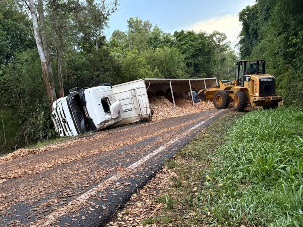 Um caminhão carregado de cavaco tombou na rodovia PR-281, nas proximidades da ponte sobre o Rio Jaracatiá, no limite entre os municípios de Dois Vizinhos e Salto do Lontra, na tarde desta sexta-feira (9). O acidente ocorreu por volta das 17h40min, quando o veículo trafegava no sentido Salto do Lontra.