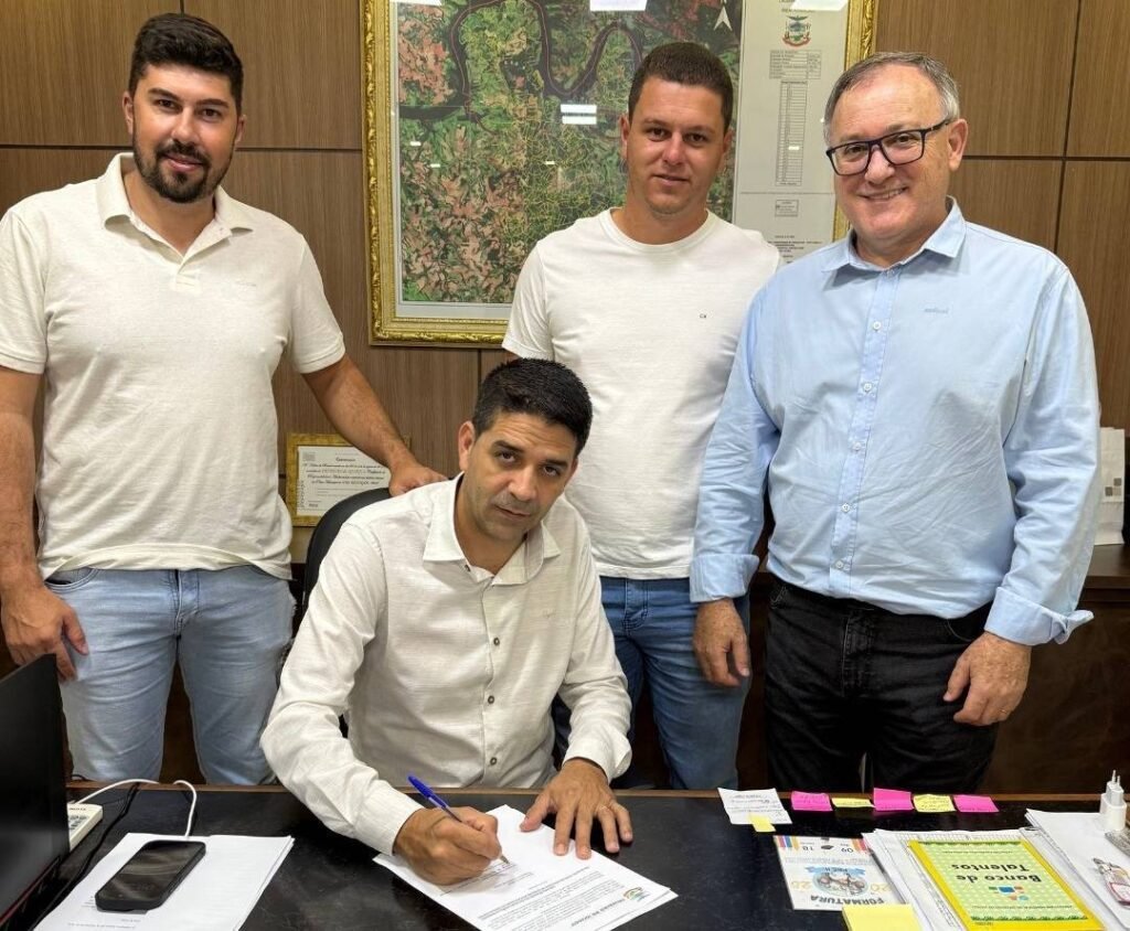 O prefeito de Cruzeiro do Iguaçu, Jean Cardoso, assinou, na última terça-feira, 2, dois projetos importantes: o primeiro trata da Governança Participativa para a Sustentabilidade, da Itaipu Binacional, e o segundo é o Pacto pela Inovação, do Governo do Estado do Paraná. O ato de assinatura contou com a presença do presidente da câmara, Juliano Morelli, do vereador Matheus Beletini e do secretário Vilmar Possato Duarte.