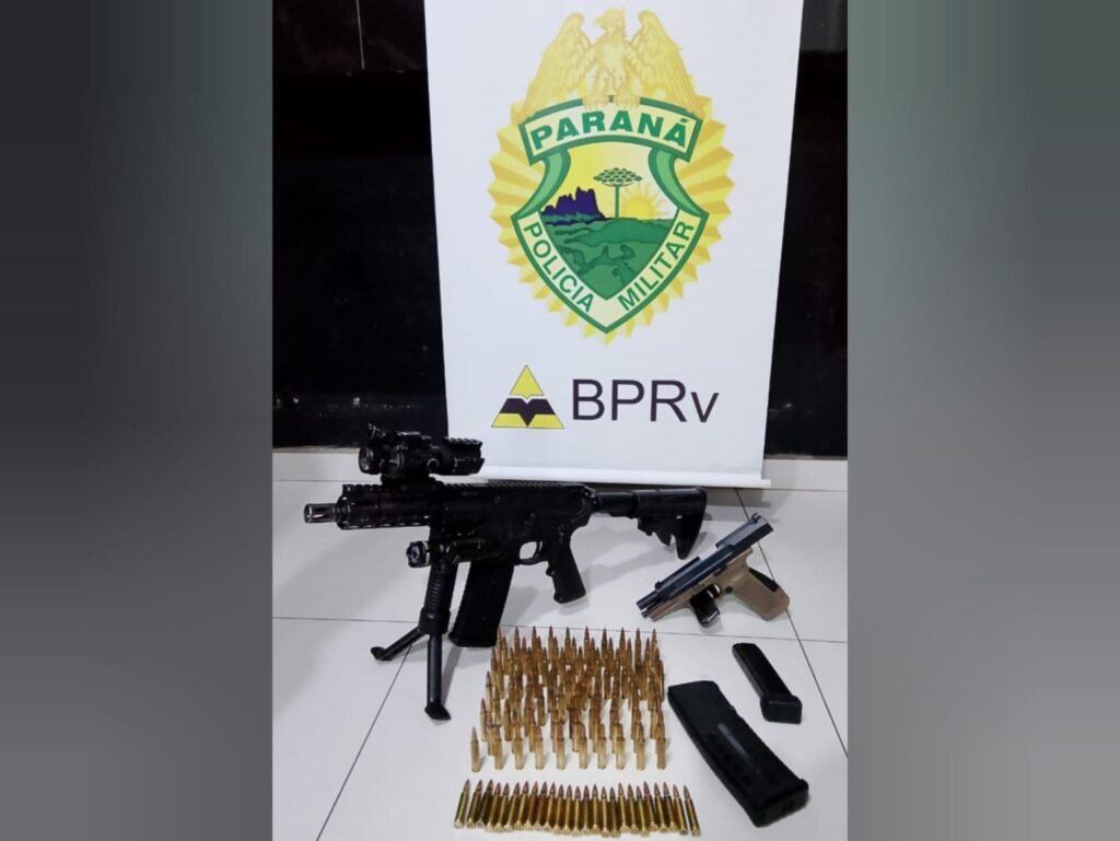 Durante Operação Bloqueio na madrugada desta quinta-feira (17), na PR-182, no município de Ampére, a equipe Canil da 6ª Companhia do Batalhão de Polícia Rodoviária abordou um veículo conduzido por um homem natural do Rio Grande do Sul. Em vistoria no carro, os policiais localizaram um Fuzil 5,56x45mm, acompanhado de luneta, mira laser e dois carregadores, uma pistola 9mm e 144 munições 5,56x45mm, não sendo informado sua origem ou seu destino, portanto, foi encaminhado à Central de Flagrantes.