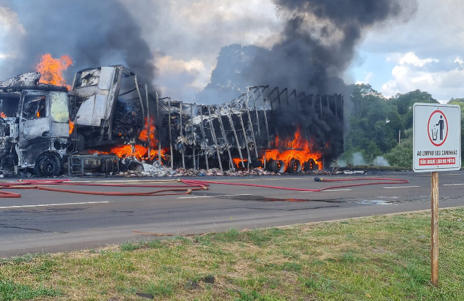 Caminhão carregado de carne é destruído pelo fogo na BR-280