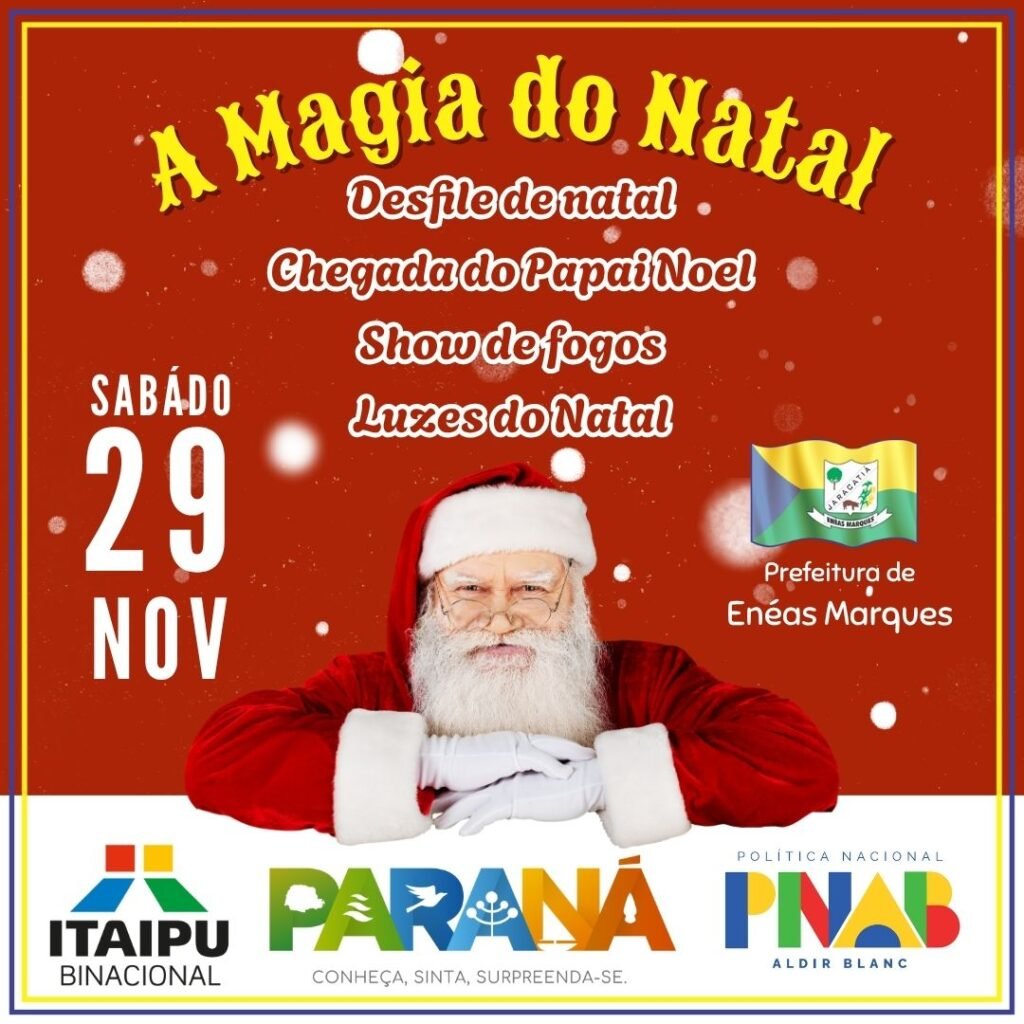 A Prefeitura de Enéas Marques convida toda a população para participar do Desfile de Natal 2025, uma grande celebração que também marca o aniversário do município.