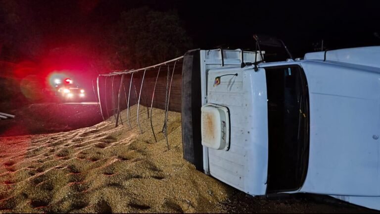 Caminhão carregado de milho tomba às margens da BR-373 em Chopinzinho