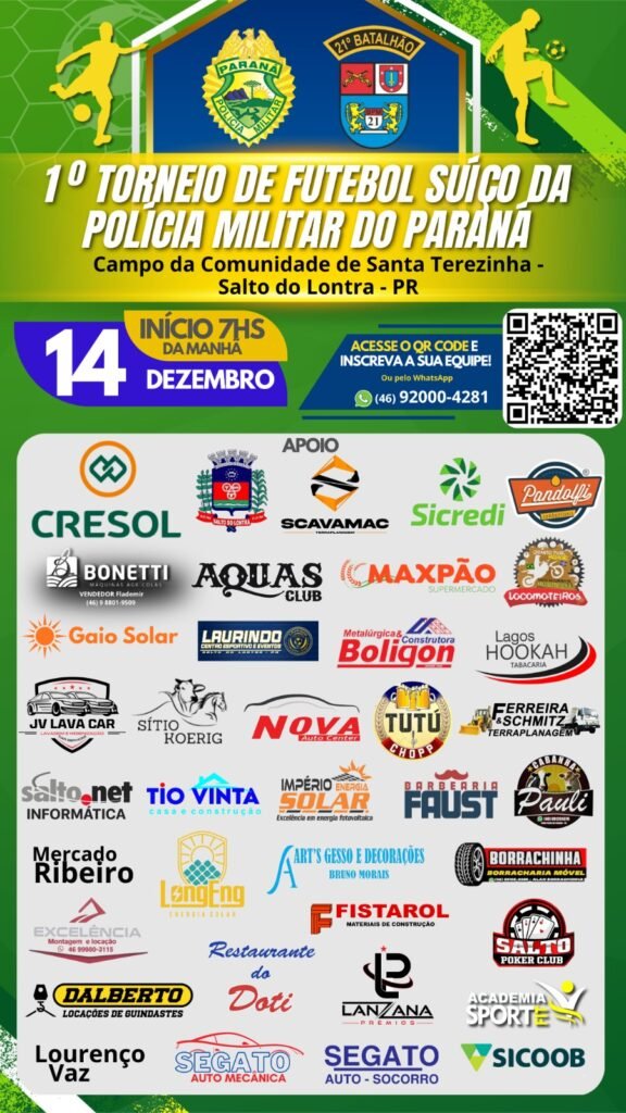 O Terceiro Pelotão da Polícia Militar da Comarca de Salto do Lontra convida atletas e desportistas para participar do 1º Torneio de Futebol Suíço, que será realizado no Campo da Comunidade de Santa Terezinha, em Salto do Lontra.